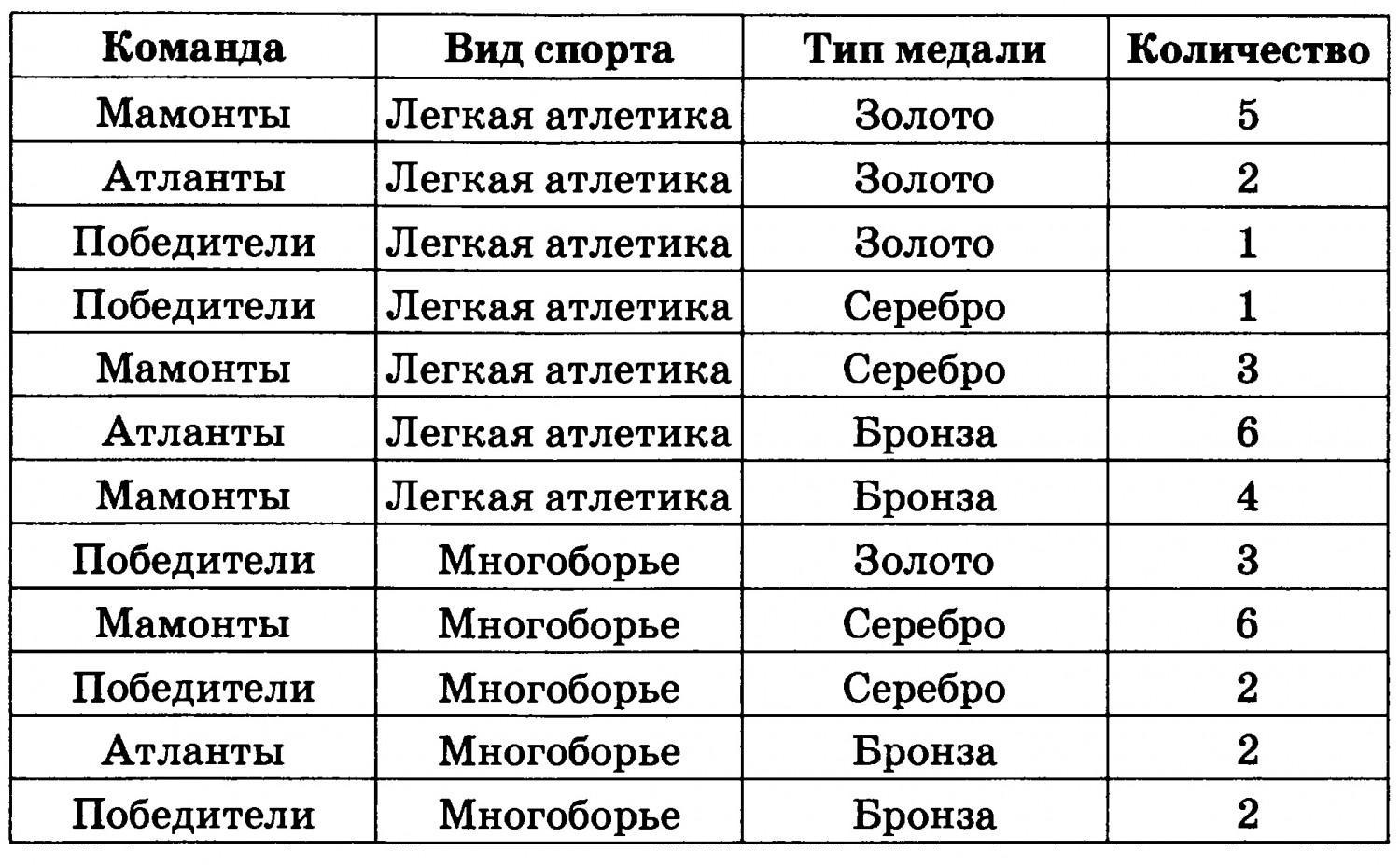 Ниже в табличной форме представлен фрагмент базы данных "Результаты соревнований" Сколько записей в данном фрагменте удовлетворяют условию (Команда="Победители") И (Количество медалей > 1) ?