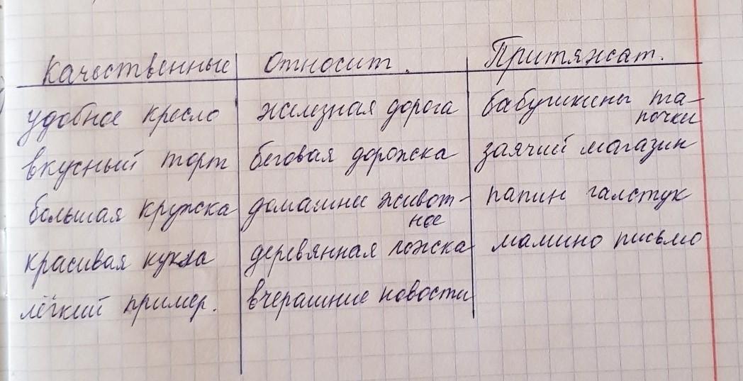 № 2 Распредели словосочетания в три столбика по разрядам имён прилагательных.