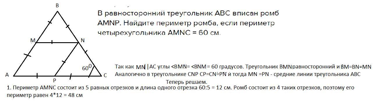 В равносторонний треугольник ABC вписан ромб AMNP. Найдите периметр ромба, если периметр четырехугольника AMNC = 60 см.