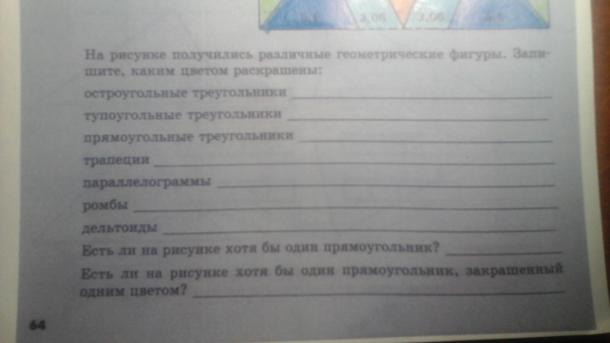 На рисунке получились различные геометрические фигуры.Запишите , каким цветом раскрашены.Пожалуйста, помогите! Срочно!