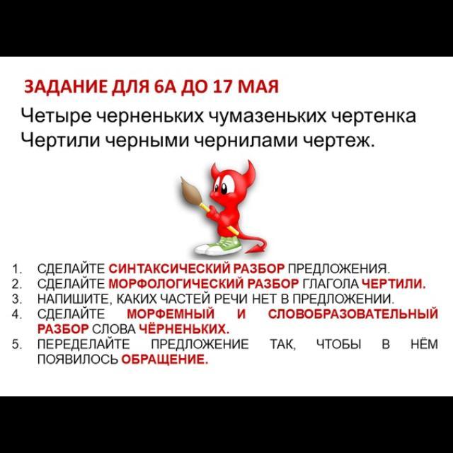 Четыре (дополнение) чёрненьких (определение) чумазеньких (определение) чертёнка (дополнение) чертили (сказуемое) чёрными (определение) чернилами (дополнение) чертёж (дополнение).