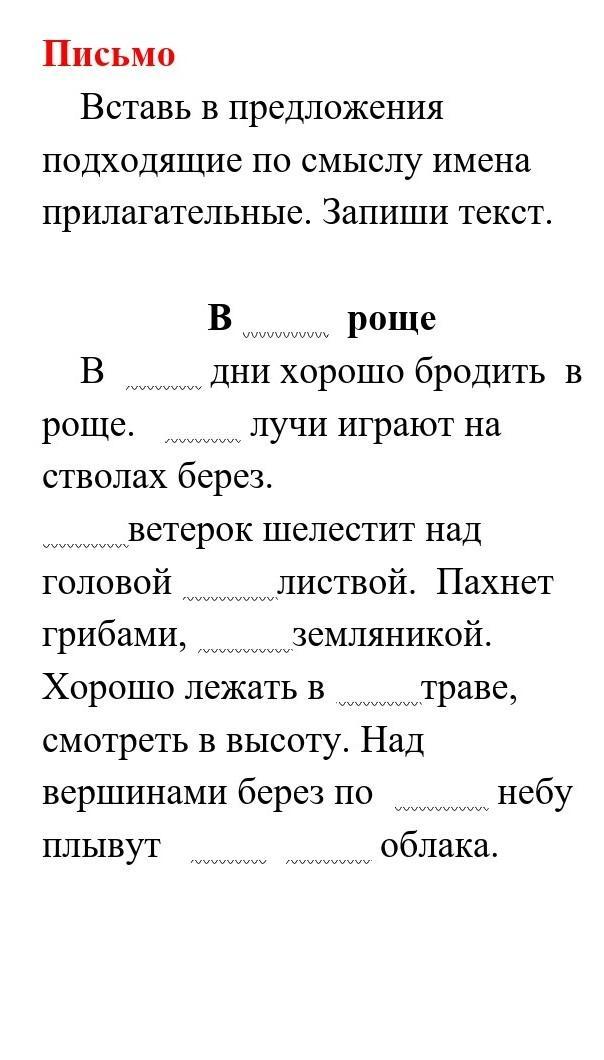 Вставь в предложения подходящие по смыслу имена прилагательные. Запиши текст.