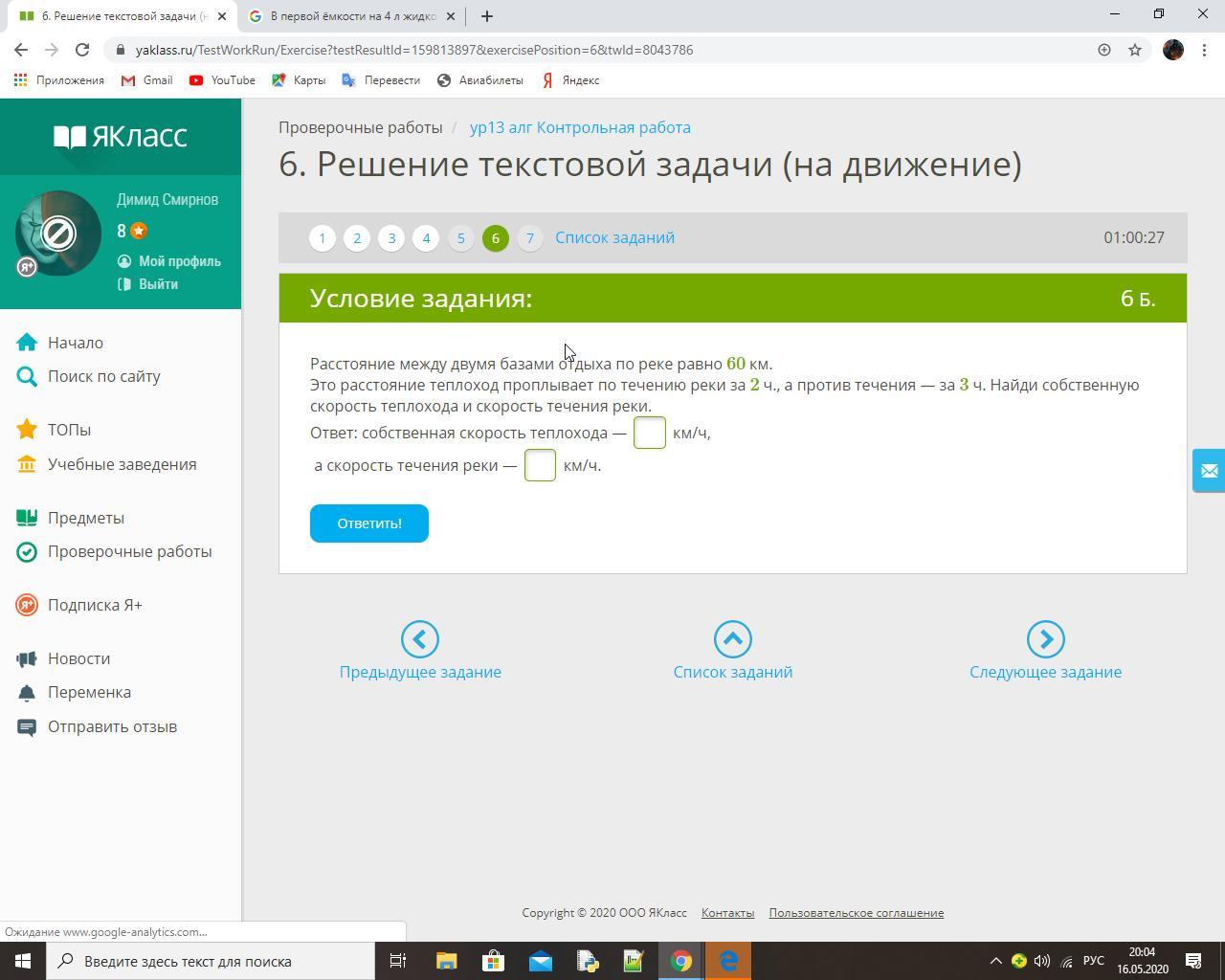 Время - по течению 2 часа ,против течения 3 часа. Отсюда находим скорость=путь/время