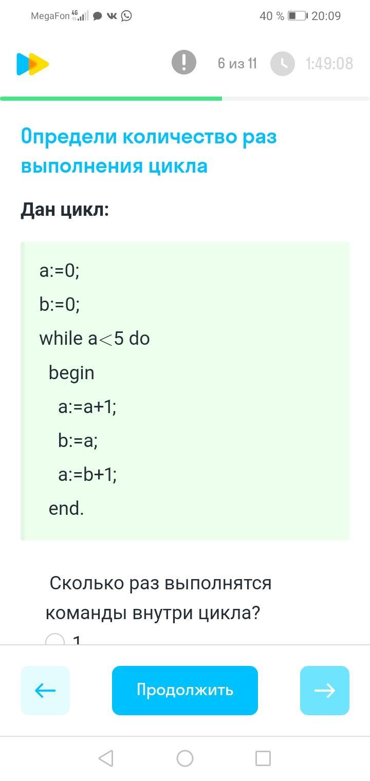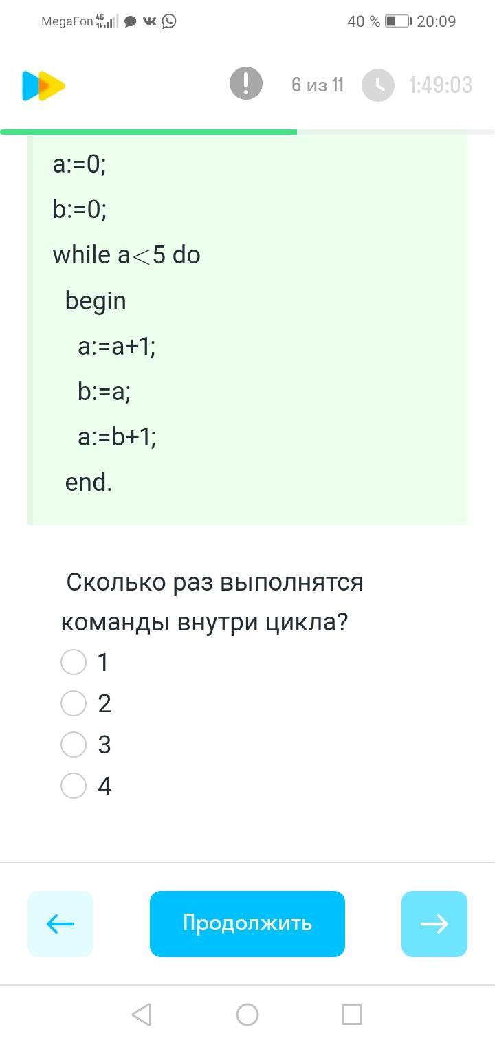 правильный ответ 3, т.к. а будет равна при входе в цикл 0, потом 2 и, наконец, 4.