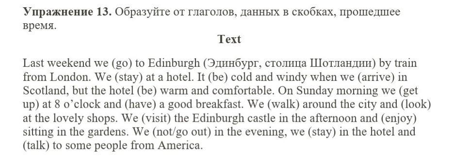 Last weekend we went to Edinburgh by train from London. We stayed at a hotel. It was cold and windy when we arrived in Scotland, but the hotel was warm and comfortable. On sunday morning we got up at 8 o'clock and had a breakfast. We walked around the city and looked at the lovely shops. We visited the Edinburgh castle in the afternoon and enjoyed sitting in the garden s. We didn't go out in the evening, we stayed in the hotel and talked to some people from America.
