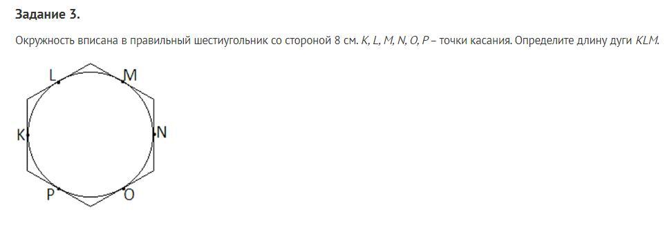 Окружность вписана в правильный шестиугольник со стороной 8 см. K, L, M, N, O, P – точки касания. Определите длину дуги KLM.