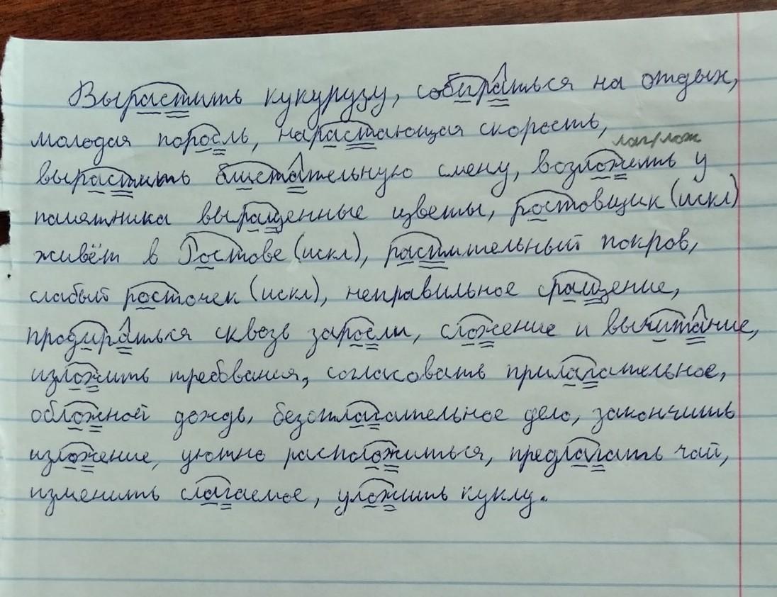 Выр..стить кукурузу, соб..раться на отдых, молодая пор..сль, нар..стающая скорость, выр..стить бл..стательную смену, возл..жить у памятника выр..щенные цветы, р..стовщик живет в Р..стове, р..стительный покров, слабый р..сточек, неправильное ср..щение, прод..раться сквозь зар..сли, сл..жение и выч..тание, изл..жить требования, согласовать прил..гательное, обл..жной дождь, безотл..гательное дело, закончить изл..жение, уютно распол..житься, предл..гать чай, изменить сл..гаемое, ул..жить куклу.