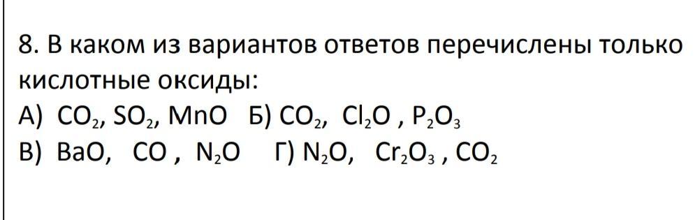Потому что кислотные оксиды образуются с неметаллами, в остальных группах присутствуют основные оксиды, такие как MnO,BaO,Cr2O3, только в группе Б все оксиды образованы с неметаллами, поэтому они кислотные, при добавлении к ним воды образуются кислоты