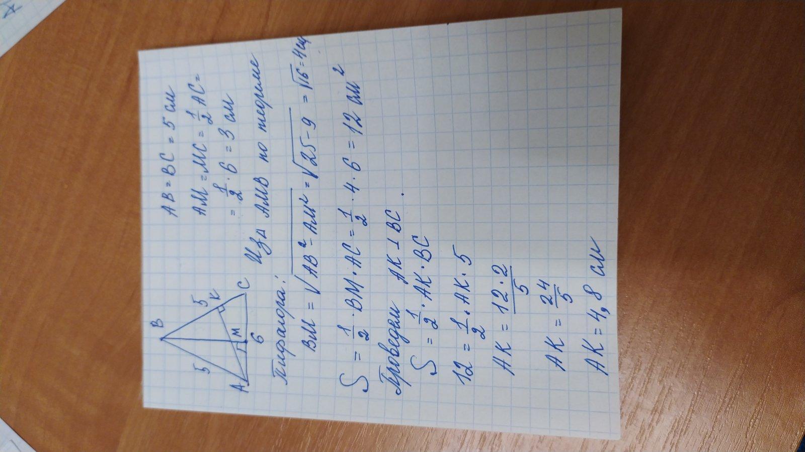 стороны равнобедренного треугольника равны 6 см 5 см и 5 см Найдите площадь и высоту проведённую к боковой стороне этого треугольника