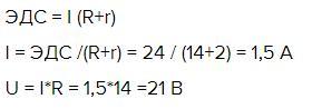 Электрическая лампочка сопротивлением 14 Ом подключена к аккумулятору с э.д.с. 24 В и внутренним сопротивлением 2 Ом. Определить в СИ напряжение на лампочке.