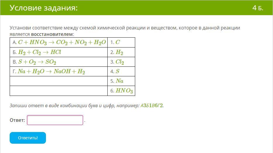 Установи соответствие между схемой химической реакции и веществом, которое в данной реакции является восстановителем: