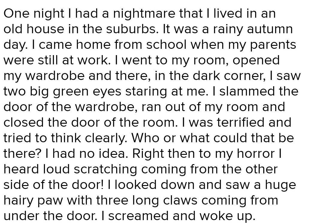 Однажды ночью мне приснился кошмар, что я живу в старом доме в пригороде. Был дождливый осенний день. Я вернулся домой из школы, когда мои родители еще были на работе. Я пошел в свою комнату, открыл шкаф и там, в темном углу, увидел два больших зеленых глаза, уставившихся на меня. Я захлопнула дверцу шкафа, выбежала из своей комнаты и закрыла за собой дверь комнаты. Я был в ужасе и пытался мыслить ясно. Кто или что там может быть? Я и понятия не имел. И тут, к своему ужасу, я услышал громкий скрежет, доносящийся с другой стороны двери! Я посмотрел вниз и увидел огромную волосатую лапу с тремя длинными когтями, выходящую из-под двери. Я закричала и проснулась.