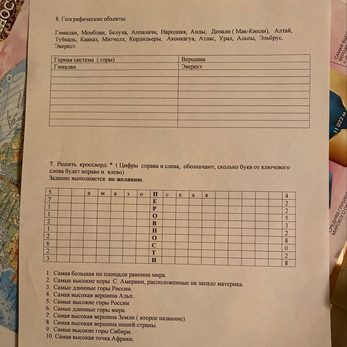 8. Горная система: Гималаи, Аппалачи, Анды, Денали, Алтай, Тубкаль, Кавказ, Митчелл, Атлас, Урал, Альпы, Эльбрус.