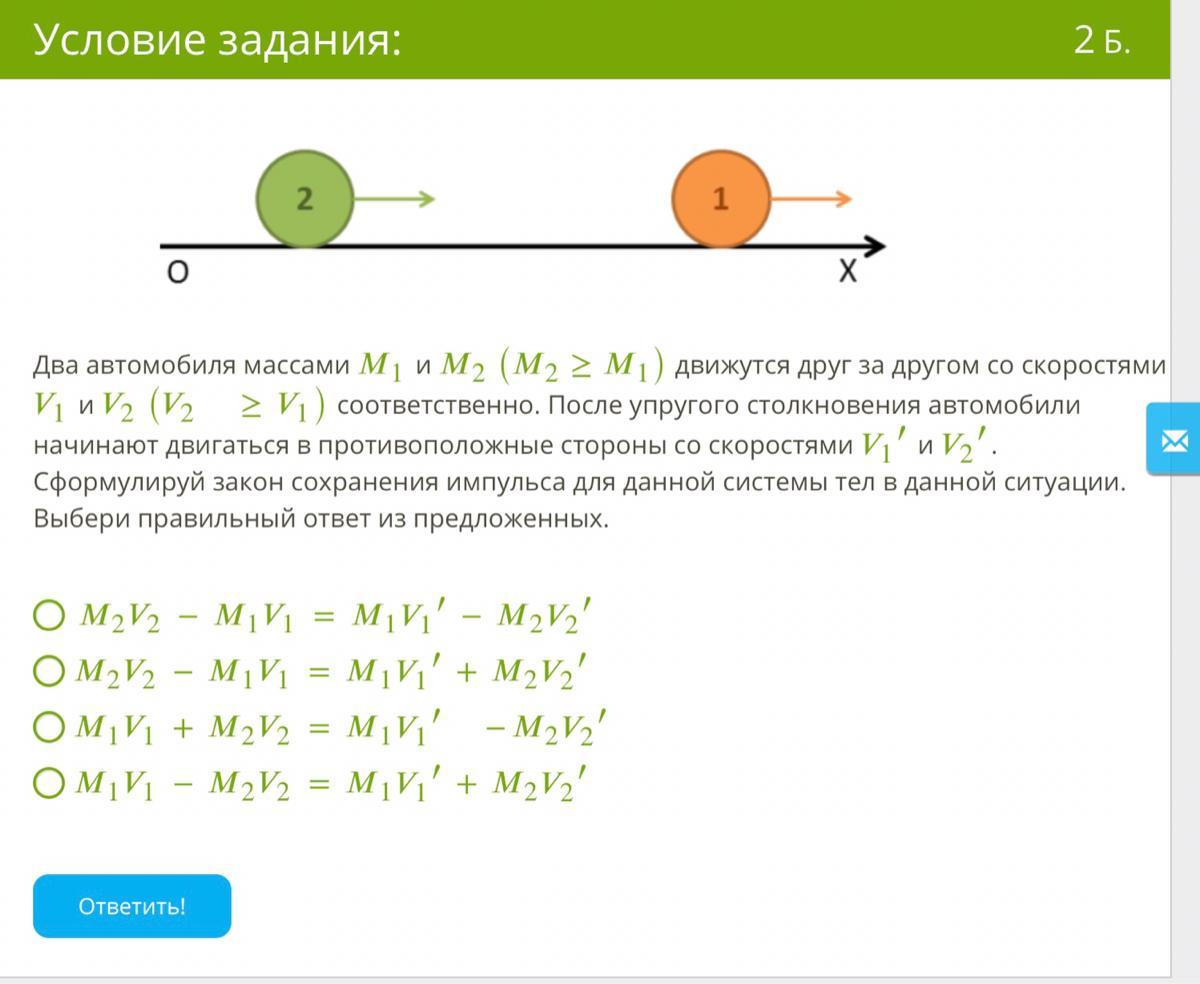 Ответ: 3 (где M1V1 + M2V2 = M1V1’ - M2V2’)