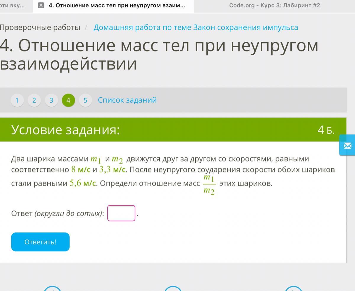 Здесь v1 = 8 м/с, v2 = 3,3 м/с, v’ = v(общ) = 5,6 м/с. Подставим эти значения в уравнение: