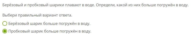 Следовательно, березовый шарик погрузится в воду глубже, чем пробковый того же размера.