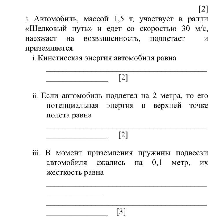 5. Автомобиль, массой 1,5 т, участвует в ралли «Шелковый путь» и едет со скоростью 30 м/с, наезжает на возвышенность, подлетает и приземляется