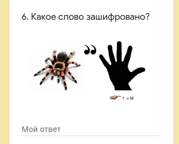 Объяснение: Паук, две запяты означают, что нужно убрать 2 последние буквы. На руке 5 пальцев и написано заменить 1 букву на м, значит было пять станет мять складываем. Получаем Память