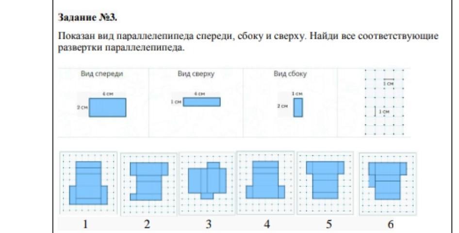 показан вид параллелепипеда спереди сбоку и с сверху.Найди все соответствуещи развертки параллепипида