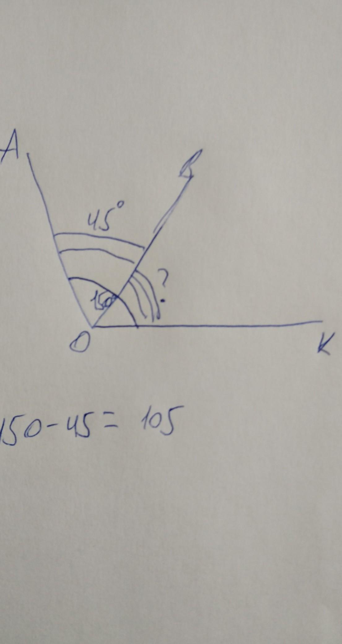 105 градусов. 150 это сам большой угол, в нём проведён луч. Потому надо 150 - 45.