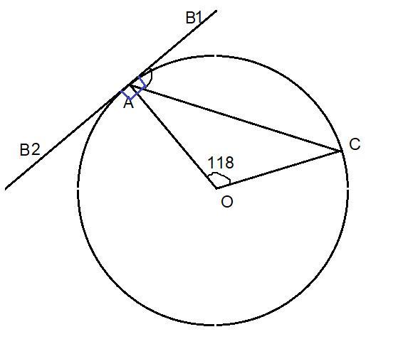 У колі з центром у точці О проведено хорду АС та дотичну АВ, точка А – точка дотику кола та прямої. Знайдіть величину <САВ, якщо <АОС = 118⁰ .