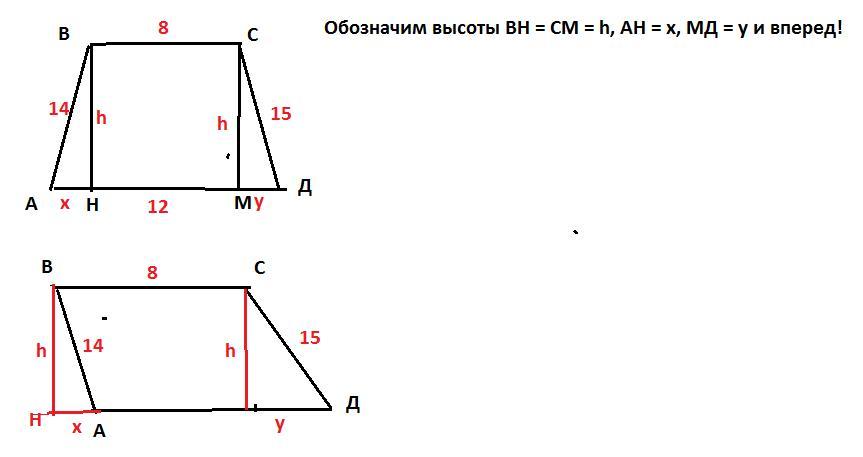 Из СМД будет h² = CД² - у² и так как левые части равны, приравняем и правые части АВ²-х² = СД² -у² или подставив значения боковых сторон 14²-х² = 15²-у² а отсюда уже