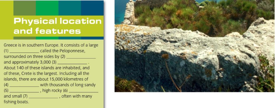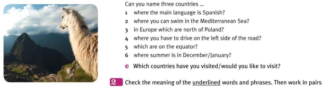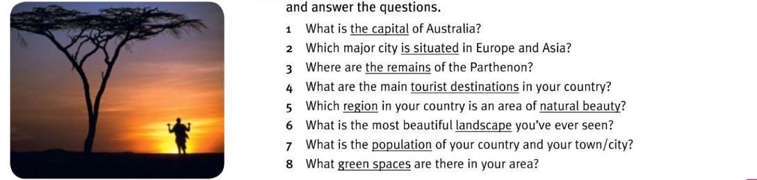 5 задание-E In pairs, answer the questions. 1 Is your country an island or not? 2 Is there a famous river or lake near where you live? 3 Do you prefer holidays near a beach or a mountain? 4 Are there any cliffs or bays in your region? 5 Is there a peninsula near where you live? 6 Does your country have a long coast?