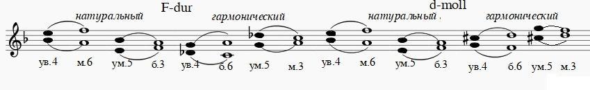 К тритонам относятся увеличенная кварта и уменьшённая квинта. Тритоны - это диссонирующие интервалы, качественная величина которых, исходя из названия, составляет три тона (или шесть полутонов). В каждой тональности есть две пары тритонов: два в натуральном и два в гармоническом виде. Напомню, что в мажоре гармонического вида понижается VI ступень (в F-dur это ре♭), а в миноре гармонического вида повышается VII ступень (в d-moll это до♯).