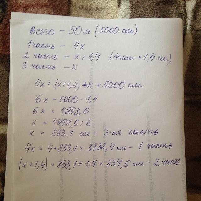Провод длиной 50 м разрезали на 3 части,причем первая часть в 4 раза длиннее третьей, а вторая - на 14 мм длиннее третьей. Найди длину каждой части провода.