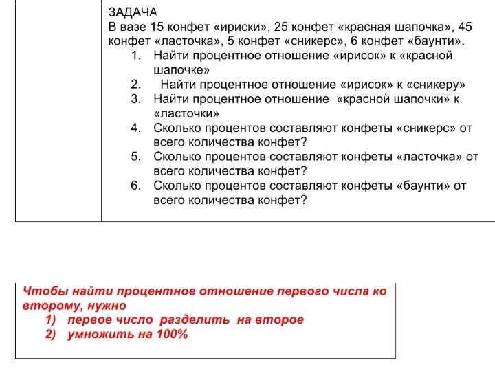 - Ответ: 1. 15 : 25 * 100 = 60% 2. 15 : 3 * 100 = 500% 3. 25 : 45 * 100 = 55,5555556% 4. 5 : 106 * 100 = 4,7% 5. 45 : 106 * 100 = 42,45% 6. 6 : 106 * 100 ≈ 5,6%