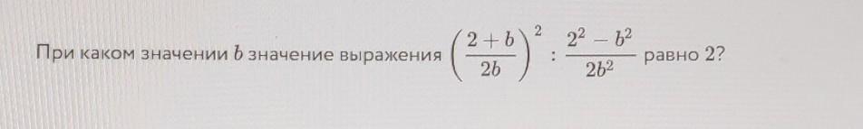 (\frac{2+b}{2b})^{2}:\frac{2^{2}-b^{2}}{2b^{2}} =2\\\\\frac{(2+b)^{2} }{4b^{2}}*\frac{2b^{2}}{(2-b)(2+b)}=2\\\\\frac{2+b}{2(2-b)}=2\\\\2+b=4(2-b)\\\\2+b=8-4b\\\\b+4b=8-2\\\\5b=6\\\\b=1,2