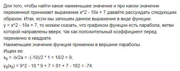 какое наименьшее значение и при каком значении переменной принимает выражение х^2-18х+7?ОЧЕНЬ СРОЧНО ДЛЯ 7 КЛАССА!!!