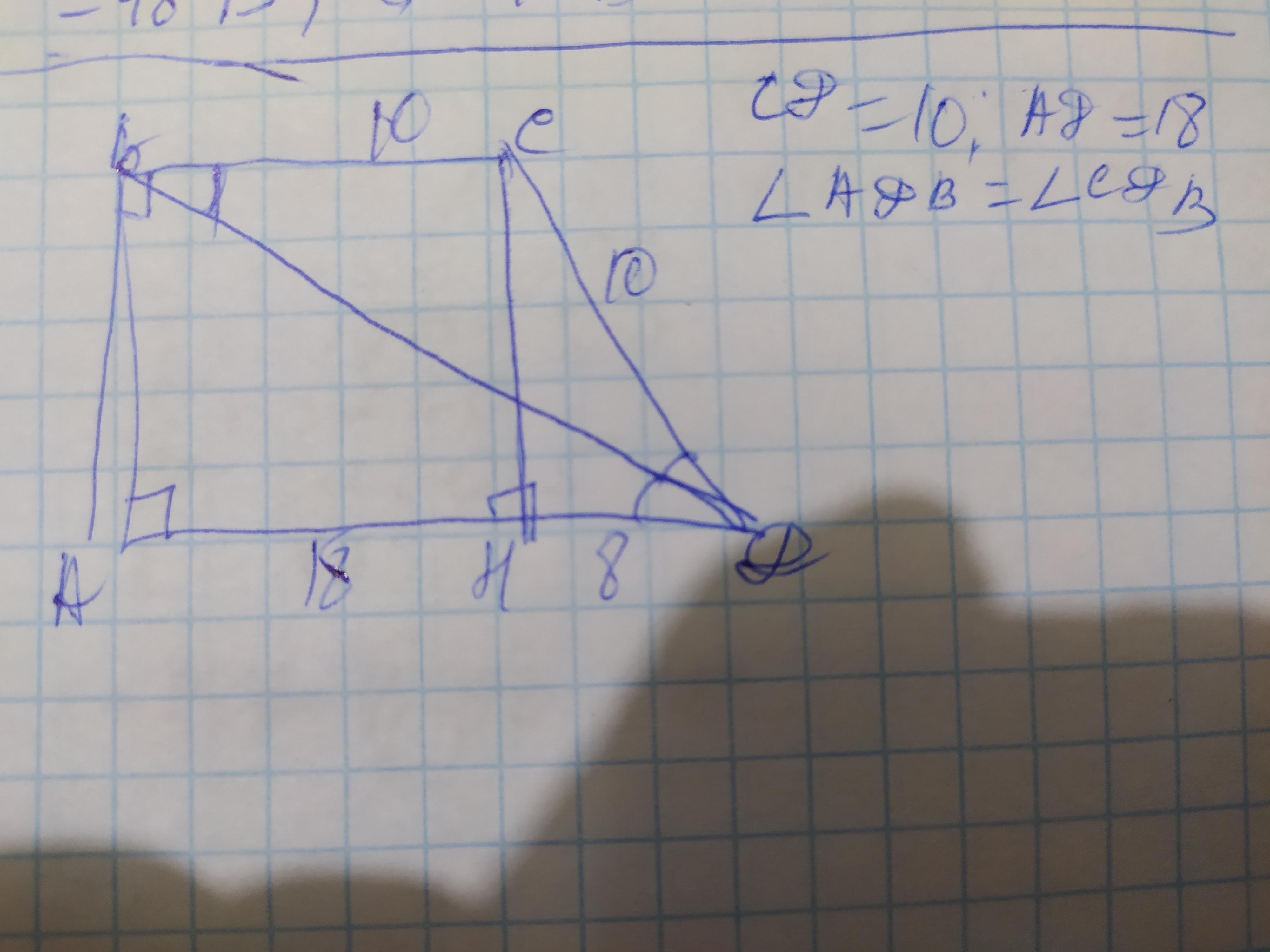 По условиям угол АДВ=углу СДА, а так как диагональ в трапеции является секущей при её параллельных основаниях, то угол СВД=углу АДВ, как внутренние разносторонние, и следовательно равен углу СДВ. Рассмотрим ∆ВСД. Так как 2 угла при его основании равны, то он является равнобедренным и стороны ВС=СД=10см. Проведём высоту СН. Она делит нижнее основание так, что АН= ВС=10см, тогда отрезок НД=18-10=8см. Рассмотрим ∆СДН. Он прямоугольный так как Н - высота. Также в нём уже известны 2 стороны, и теперь можно найти высоту СН по теореме Пифагора: СН²=СД²-НД²: