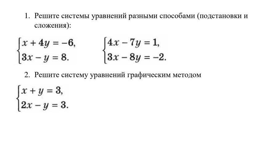 1. Решите систему уравнений разными способами(подстановки и сложения)