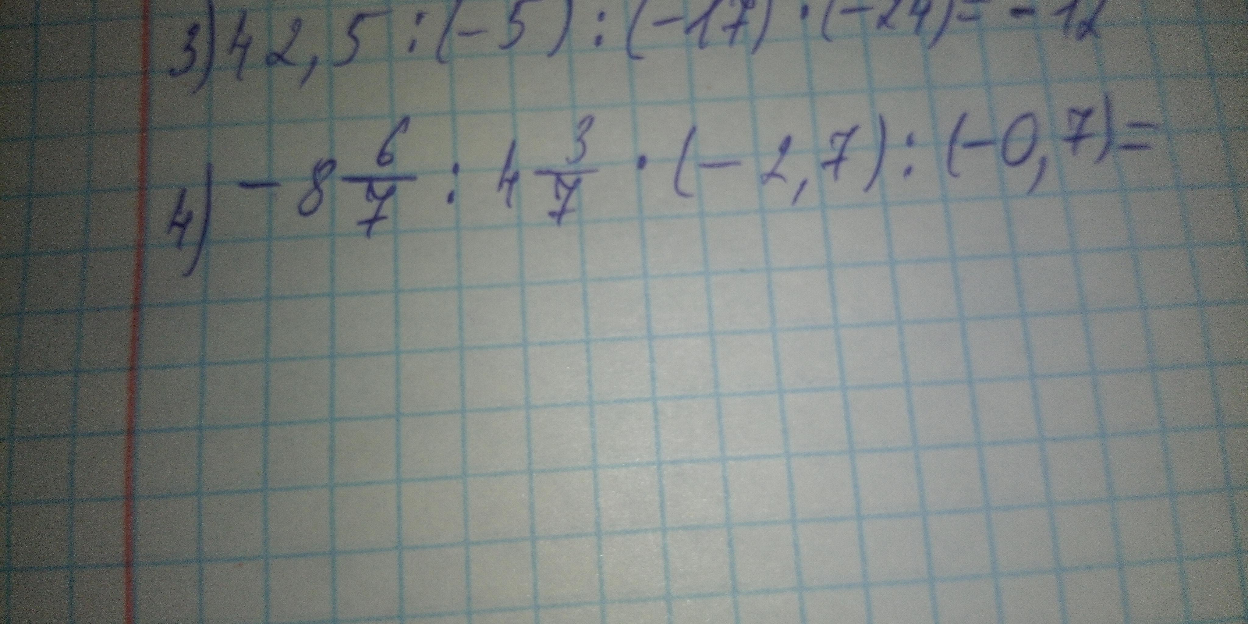 3) 5,4 : (-0,7) = 5 4/10 : (-7/10) = 5 2/5 : (-7/10) = 27/5 * (-10/7) = -54/7 = -7 5/7