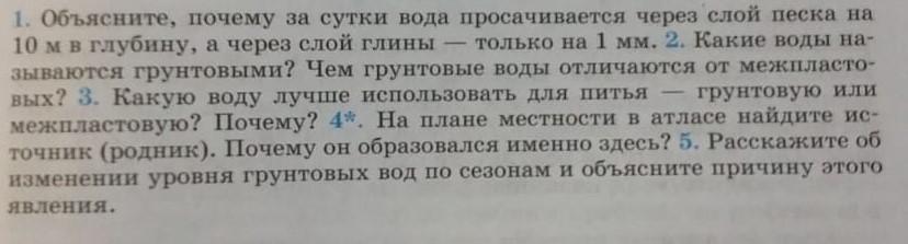 1) Просачивание воды с поверхности суши происходит только при условии, что горные породы, составляющие эту поверхность, способны пропускать воду. Для этого в них должны быть поры, трещины, пустоты. Поры — промежутки между частицами горной породы. Чем крупнее частицы, тем шире поры и тем легче через породу проходит вода. Глина имеет большую плотность, чем песок.