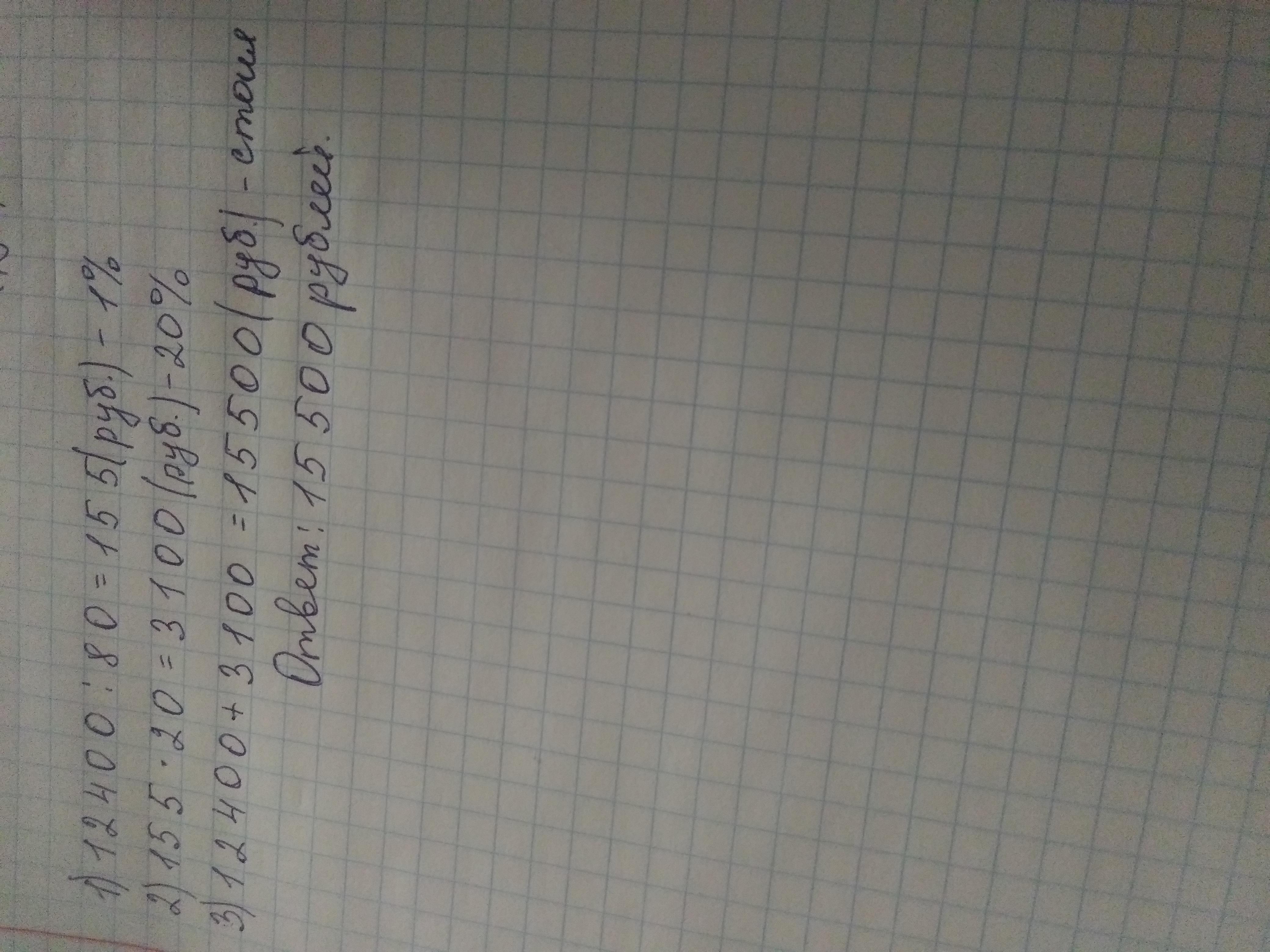 1) 12400:80%=155(рублей) это 1% от всей стоимости костюма.