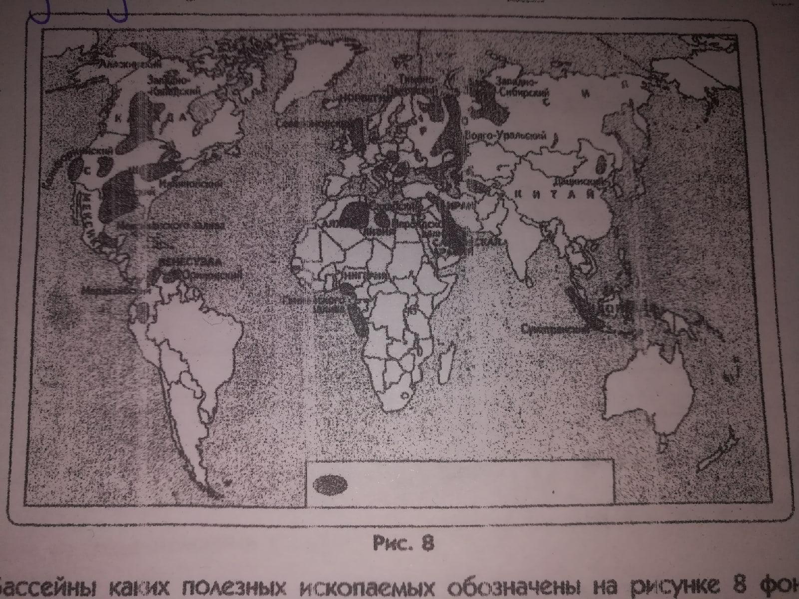 Бассейны каких полезных ископаемых обозначены на рисунке 8 фоновой окраской? С какими участками земной коры связаны месторождения этих полезных ископаемых?