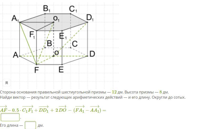 Сторона основания правильной шестиугольной призмы _12 дм . Высота призмы _8 дм. Найти вектор _результат следующих арифметических действий _ и его длину. Округли до сотых . AF - 0,5C₁F₁ +DD₁ +2DO -( FA₁ - AA₁ )