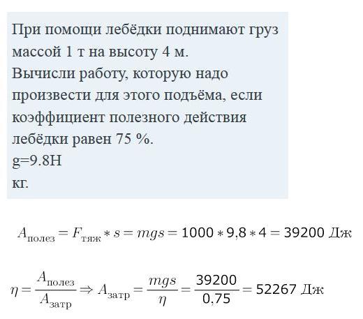 При помощи лебёдки поднимают груз массой 1 т на высоту 4 м.