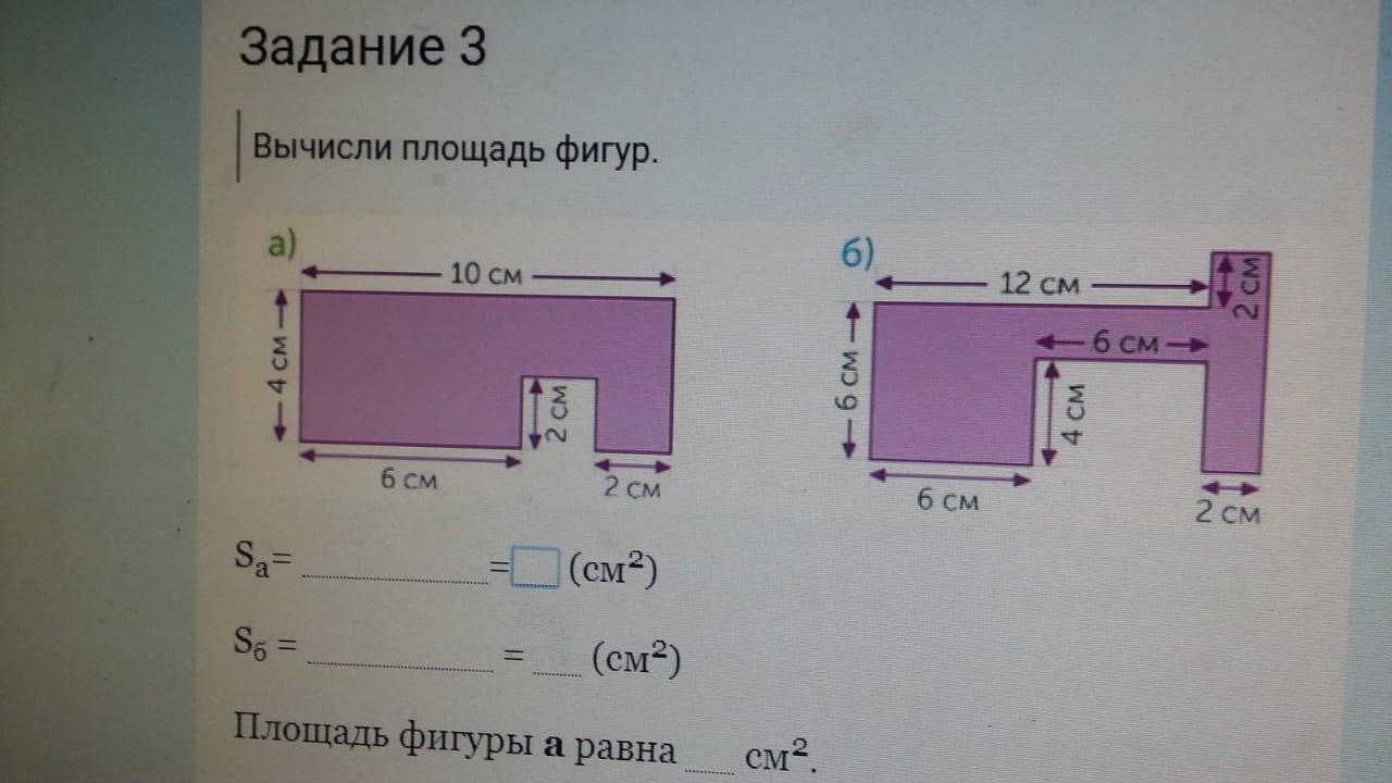 Вычисли площадь фигур. 4 см 6 см 2 см 2 см 10 см.