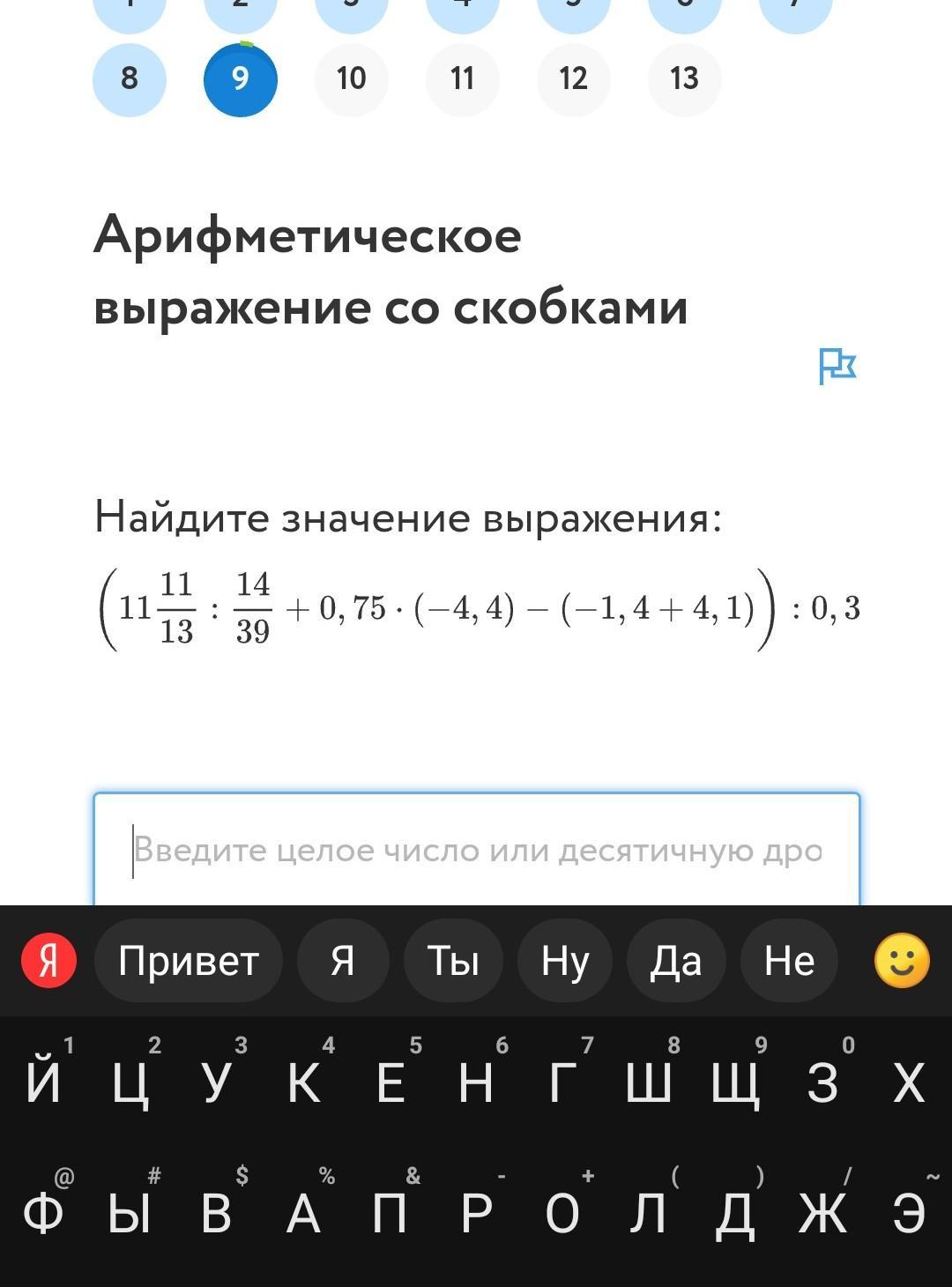 (11 11/13 : 14/39 + 0,75 * (-4,4) - ( -1,4 + 4,1) : 0,3 =