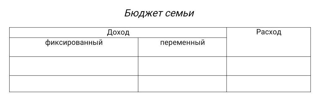 Фиксированный: зарплата главы семьи; пенсия бабушки; годовые проценты от банковского вклада, стипендия сына; бесплатные лекарства, получаемые дедушкой-инвалидом; зарплата мамы.