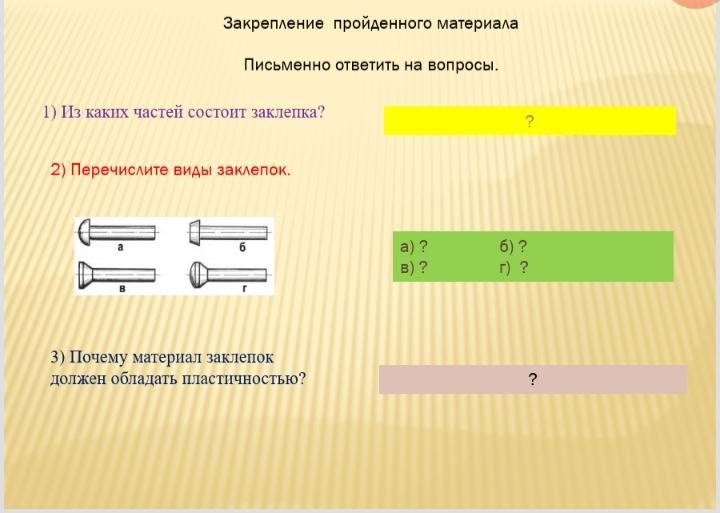 1.Заклепка состоит из головки и цилиндрического стержня, называемого телом заклепки.