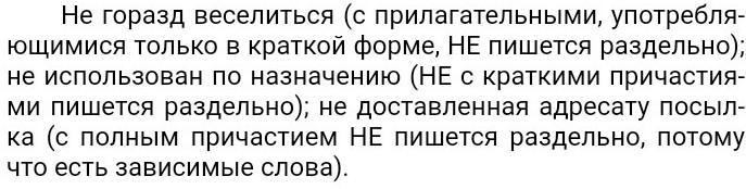 2) (Не)горазд веселиться, (не)использован по назначению, (не)доставленная адресату посылка