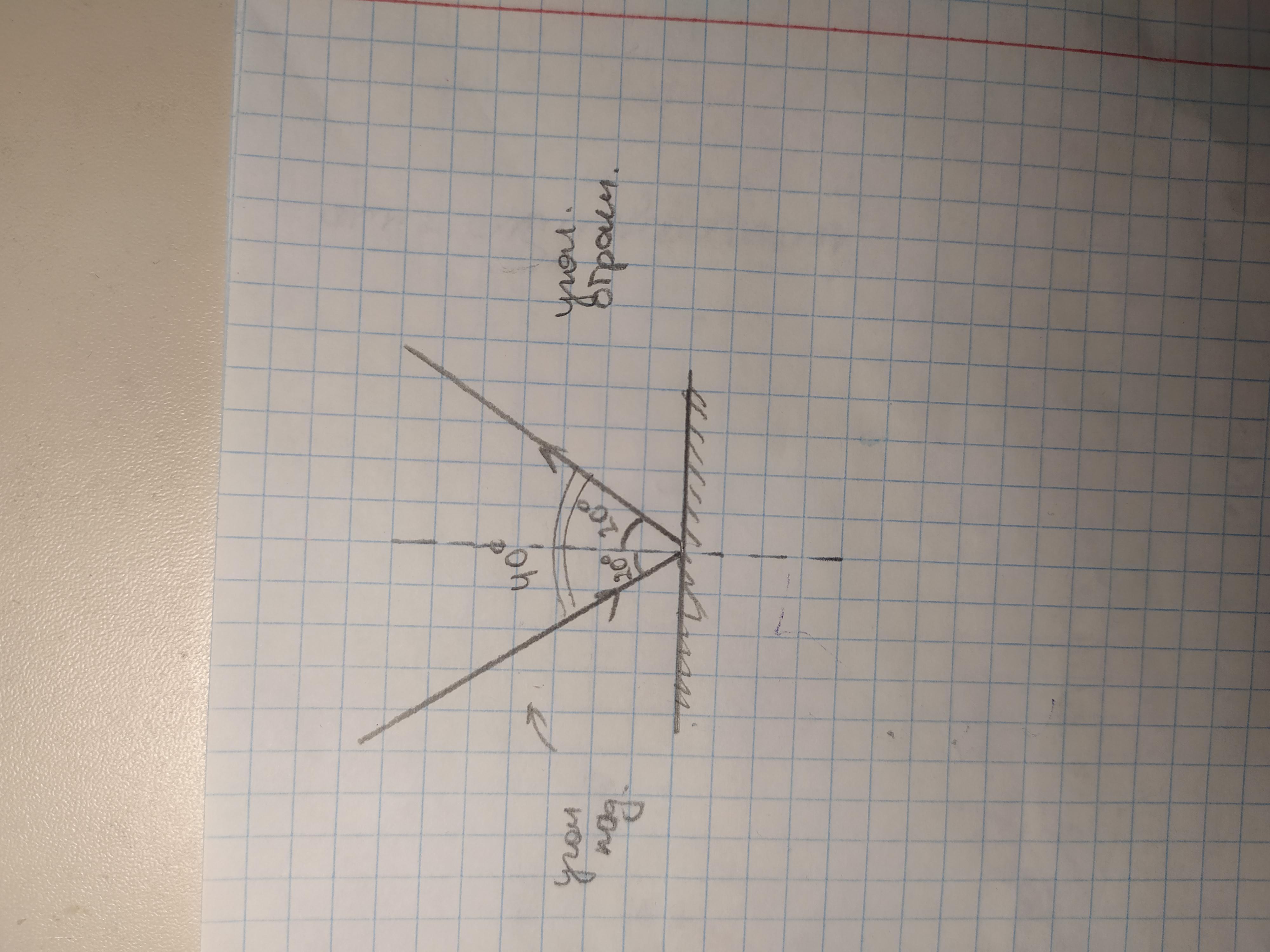Угол падения луча на зеркало 20°. Каков угол между лучом падающим и отраженным??
