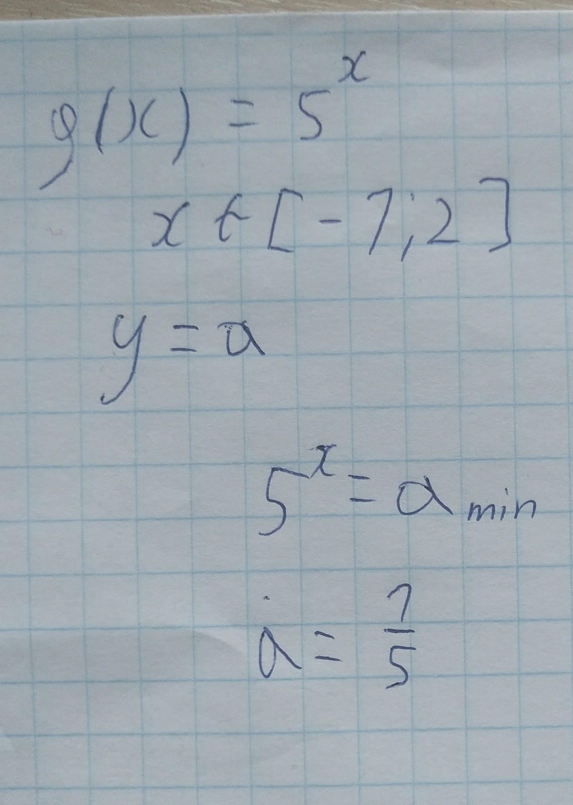 Найдите НАИМЕНЬШЕЕ значение параметра a, при котором график функции g(x) = 5^x, где x Э [-1;2], пересекает график функции y = a