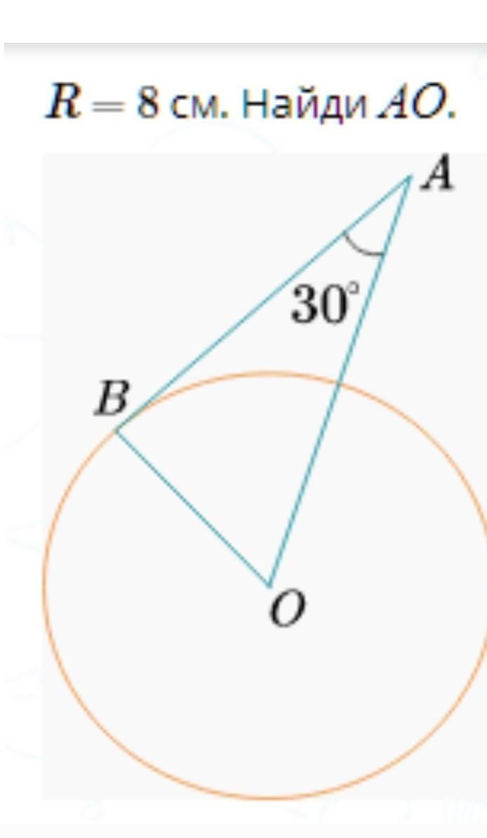 угол АВО=90 градусов(по свойству касательной), значит треугольник АОВ-прямоугольный