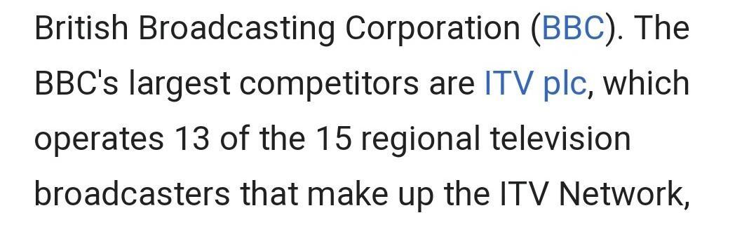 Британская радиовещательная корпорация (BBC) Наибольший конкурент BBC это UTV plc, которая работает на 13 из 15 региональных телеканалах.