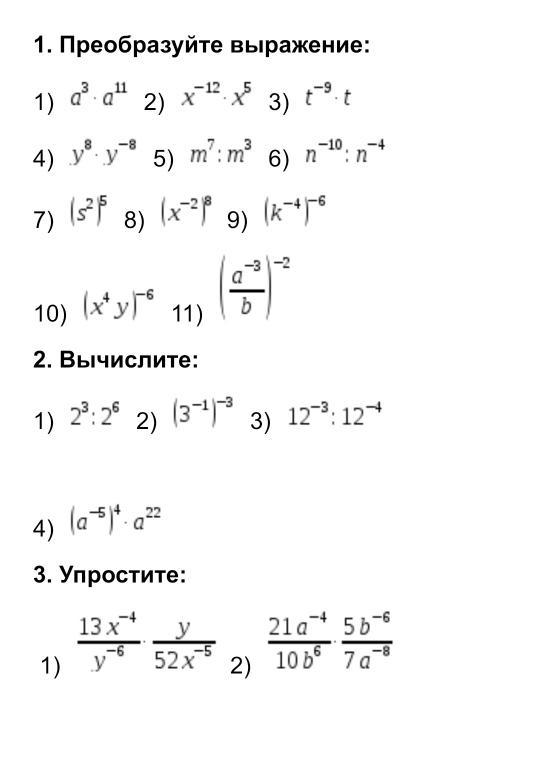 1.\; \; 1)\; \; a^3\cdot a^{11}=a^{14}\; \; ,\; \; \; 2)\; \; x^{-12}\cdot x^5=x^{-7}\; \; ,\; \; 3)\; \; t^{-9}\cdot t=t^{-8}\\\\4)\; \; y^8\cdot y^{-8}=y^0=1\; \; ,\; \; 5)\; \; m^7:m^3=m^4\; \; ,\; \; 6)\; \; n^{-10}:n^{-4}=n^{-6}